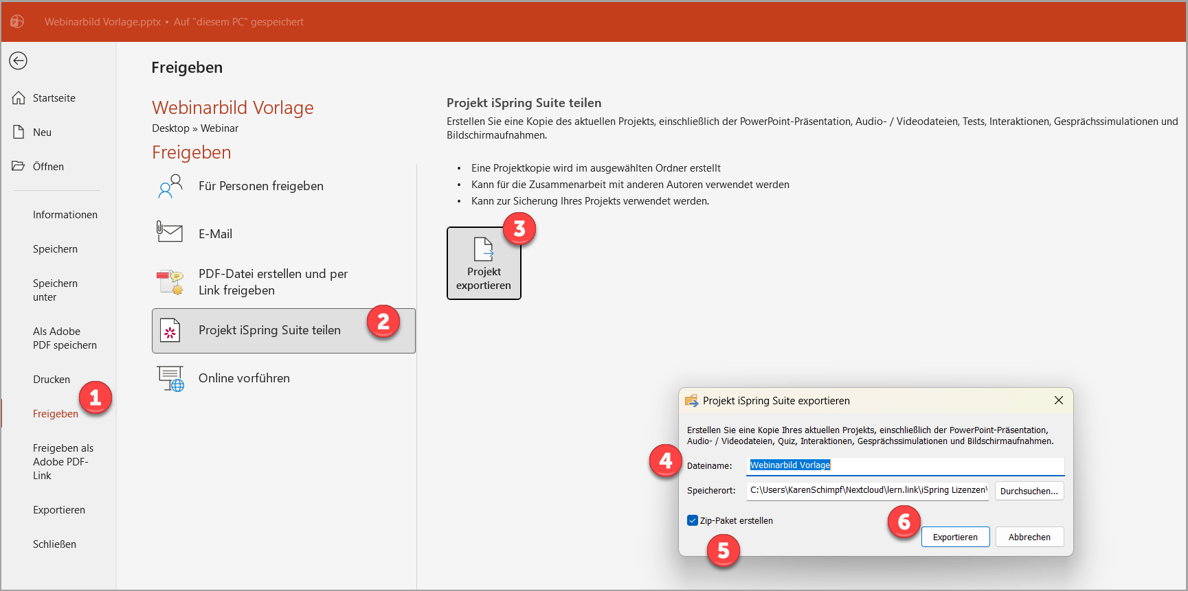 Um eine Sicherungskopie von Ihrem Projekt (also PowerPoint und dazugehörigen iSpring Inhalten) zu machen, geben Sie bitte wie folgt vor: