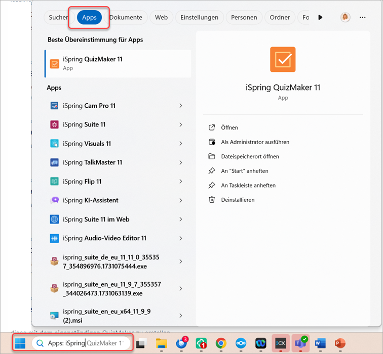 Klicken Sie in der Windows-Taskleiste auf Start (oder drücken Sie die Win-Taste auf Ihrer Tastatur) und Tippen: Apps: iSpring …….und schon tauchen alle iSpring Apps auf und Sie können sich aussuchen, welche Sie als Standalone-Produkt öffnen wollen.