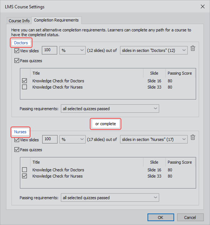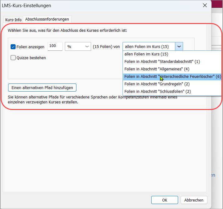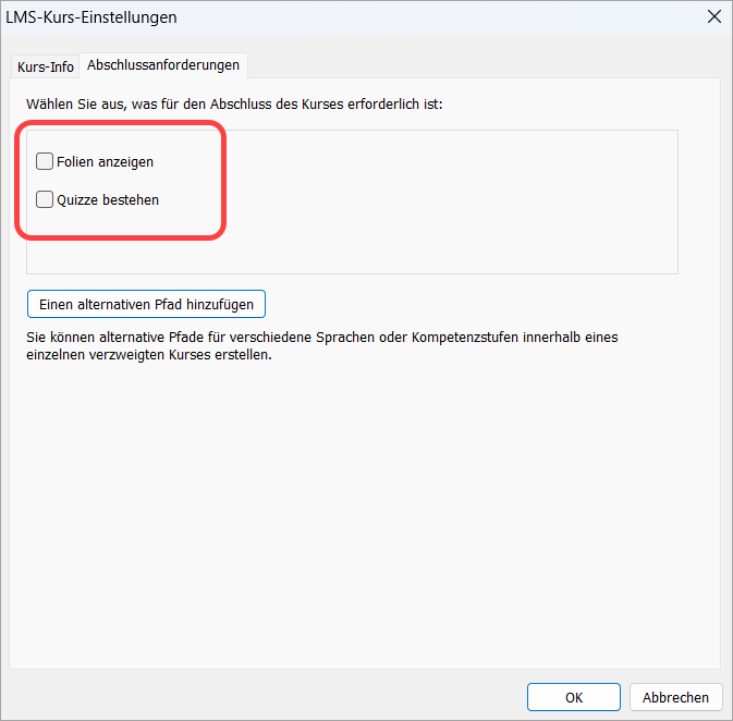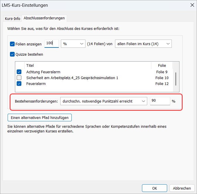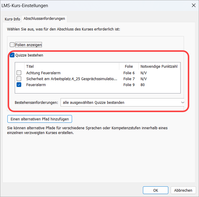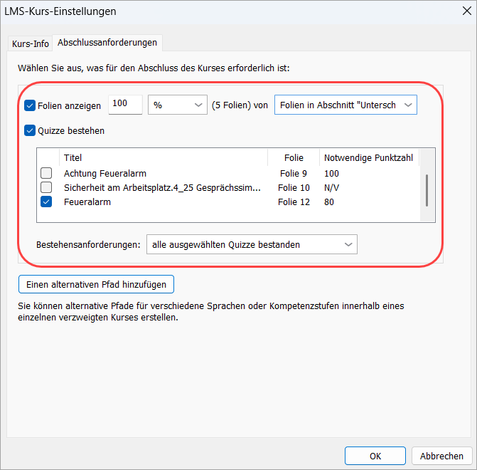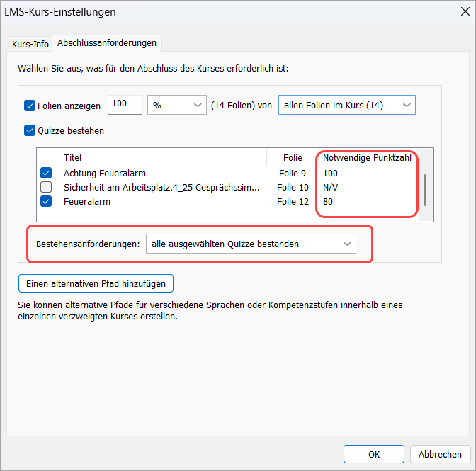Im Veröffentlichungsfenster sehen Sie nun genau, welche Bedingungen für den Kursabschluss gelten. Wenn der Kurs beispielsweise das Anzeigen aller Folien und das Bestehen der Prüfung erfordert, wird Folgendes angezeigt:
