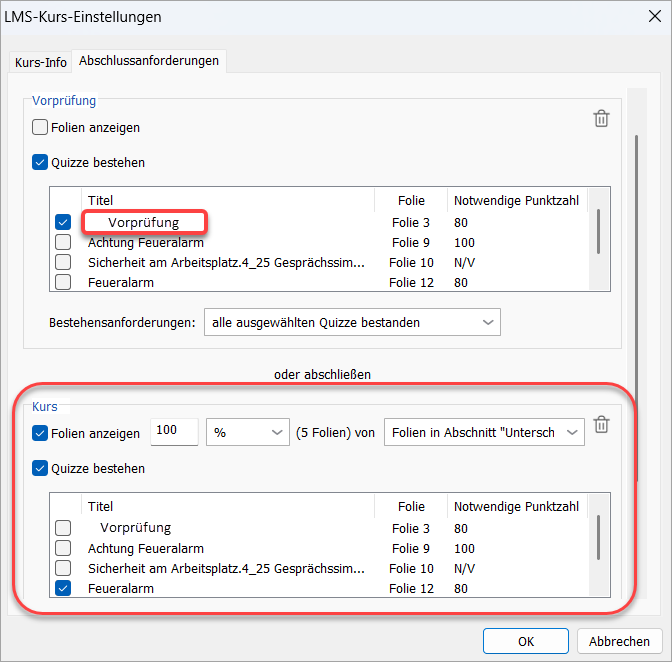 Die Kriterien für die Folienanzeige und den Quizabschluss werden nun unabhängig voneinander festgelegt. Der Folienfortschritt hat keinen Einfluss mehr auf die Bewertung – nur Bewertungen und ausgewertete Interaktionen (Abschnitt) zählen für den Abschluss.
