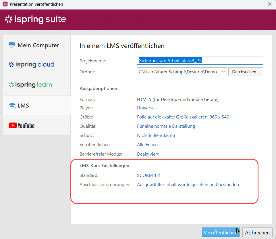 Nach der Aktualisierung der iSpring Suite auf 11.11.0.11 und höher können Sie die neuen Einstellungen sofort nutzen. Bestehende Kurse behalten ihre ursprünglichen Konfigurationen, Sie können diese jedoch jederzeit im Veröffentlichungsdialog aktualisieren.