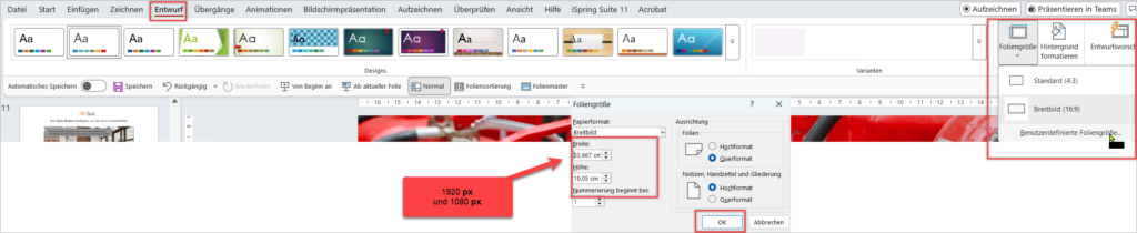 - Wechseln Sie in PowerPoint zum Reiter Entwurf und öffnen Sie die Foliengrößen-Einstellungen.