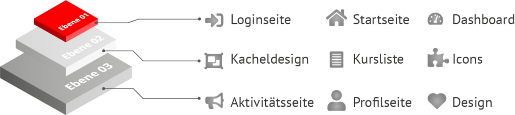 Wir unterteilen die Struktur von Moodle in Ebenen, die unsere Designpakete abbilden. Unsere erste Ebene wird im Starter Paket abgedeckt und umfasst alle wichtige Bereiche, die Ihre Corporate Identity in den Vordergrund stellen. In der zweiten Ebene, dem kundenspezifischen Paket, legt sich Ihre CI noch konsequenter über die Plattform und weitere Details, wie das Kacheldesign oder die Icons, werden angepasst.