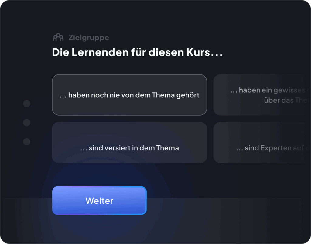 Passen Sie die Trainingserstellung an Ihre Zielgruppe an. Legen Sie die Kurslänge fest und geben die didaktische Richtung vor.