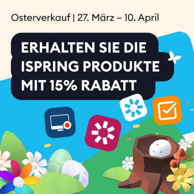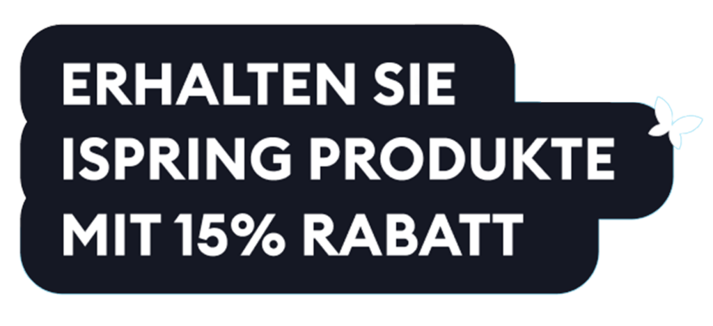 * Dieses Angebot ist für Neukunden (ohne Lizenzen bisher) und zusätzliche Lizenzen gültig. Renewals fallen nicht unter die Bedingungen des Angebots. Die Werbeaktion gilt nur für iSpring Suite Business-Lizenzen. Lizenzen können nicht auf Vorrat gekauft werden.