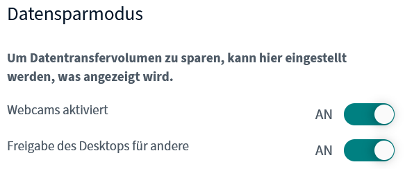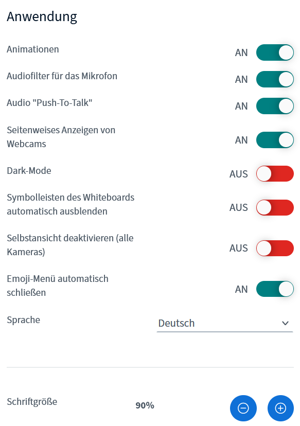 Es öffnet sich ein Menü mit den Bereichen Anwendung, Benachrichtigungen und Datensparmodus. Jede Person kann die abgebildeten Einstellungen für sich selbst vornehmen. Denken Sie daran, auf „Speichern“ zu klicken.