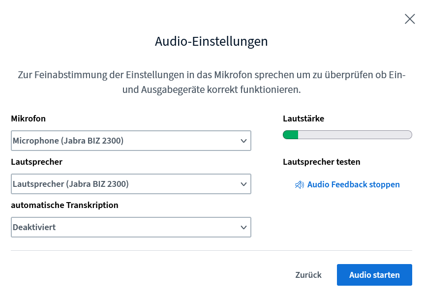 Mit „Audio starten“ betreten Sie die Konferenz.
