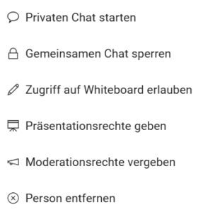 Mit Klick auf den Namen einer Person können Sie einen Privaten Chat starten oder dieser Person Zugriff auf das Whiteboard erlauben.
