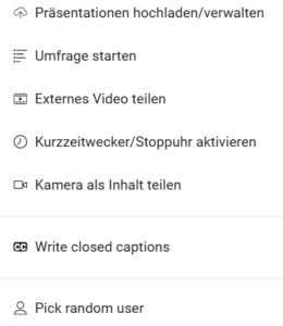 Mit Klick auf das +-Symbol öffnet sich das Menü, über das Sie sich Präsentationsrechte holen, den Kurzzeitwecker/die Stoppuhr nutzen oder automatische Transkription einstellen können.